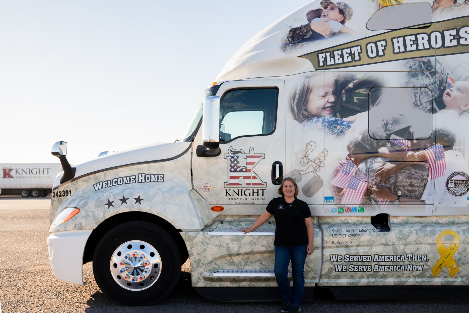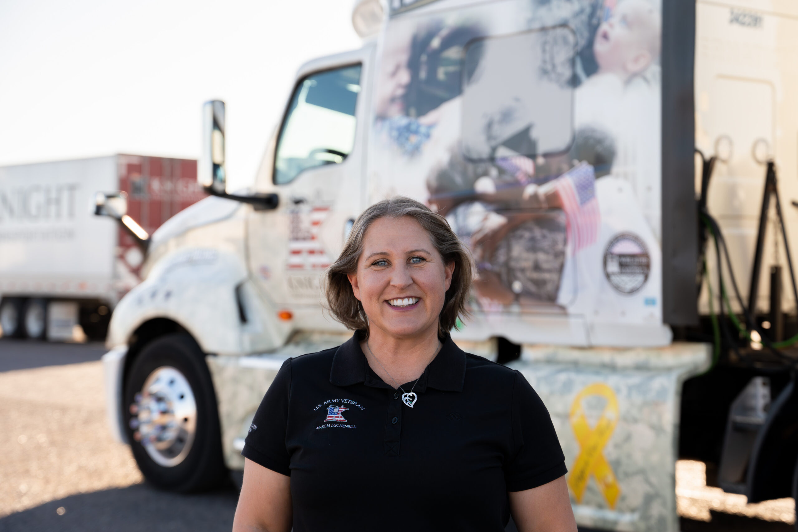 In late 2020, Marcia was selected as one of Knight’s veteran drivers to represent the company in its Fleet of Heroes program. Her truck carried the “Welcome Home” theme, honoring not just service members but the families who support them.