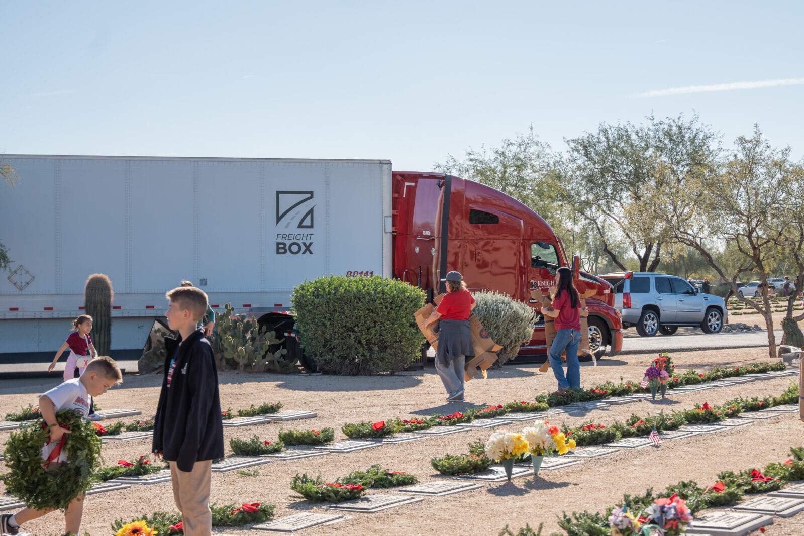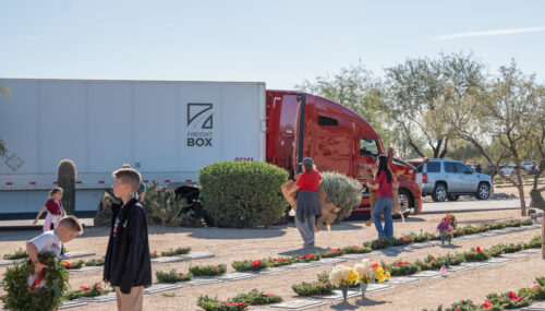 Wreaths Across America relies on dedicated volunteers and transportation partners to deliver wreaths to national and local cemeteries across the United States. Knight Transportation proudly contributed by hauling two trailers full of wreaths to the National Memorial Cemetery of Arizona and the Arlington National Cemetery, where volunteers laid them at the headstones in tribute to our nation’s heroes.